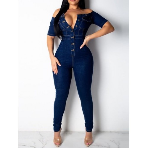 Collar Short Sleeve Buttons Bodycon Denim Jumpsuit Overalls HF2616-02-02